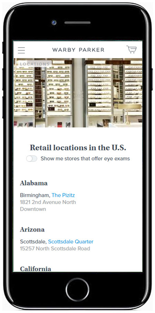 Warby Parker非常了解自己的客戶,將網(wǎng)站的地址頁針對移動(dòng)端進(jìn)行了優(yōu)化。點(diǎn)擊進(jìn)入具體地址的著陸頁會(huì)看到聯(lián)系信息、交互式地圖、照片以及位置說明。
