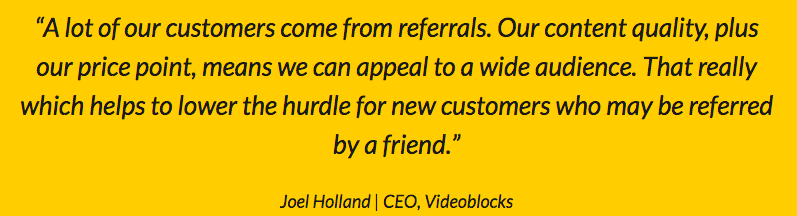 制作一支原生影片所使用到的素材可能會(huì)非常昂貴,但是Video Block 顛覆了業(yè)界的常規(guī),它提供影片素材,從短片、背景、特殊效果、甚至到AfterEffects 范本等,不論每個(gè)月下載多少內(nèi)容,都均一收費(fèi),但現(xiàn)在Referral Program 并沒(méi)有直接在網(wǎng)站上揭露。不過(guò)根據(jù) Video Block 的 CEO 的引言,推薦營(yíng)銷(xiāo)的策略的確讓他們更不費(fèi)力地招來(lái)更多許多新客戶(hù),而 Refferral Candy 的個(gè)案研究也顯示出 Video Blocks 透過(guò)推薦營(yíng)銷(xiāo)賺進(jìn) 10 萬(wàn)美元。