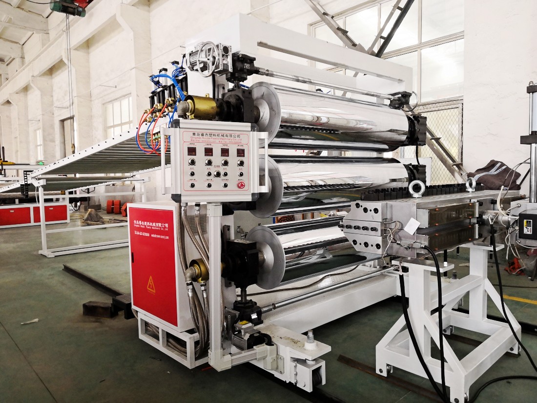 單螺桿擠出機(jī),衣架式模具,三輥壓光機(jī),冷卻托架,牽引機(jī),剪板機(jī),橫向切割機(jī),收卷機(jī)和其他輔助機(jī)械組成。