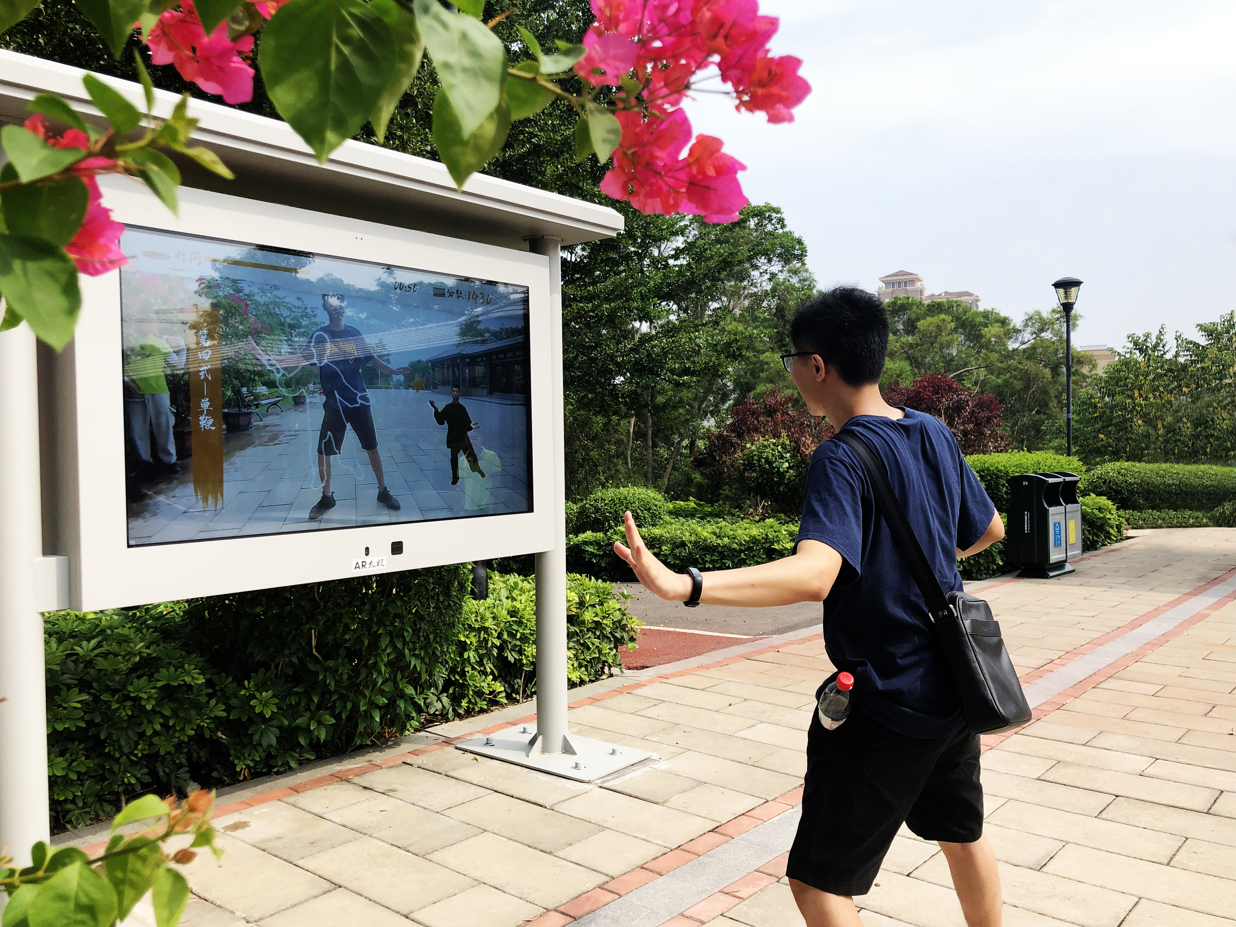 由北京分形科技承建的AR太極設(shè)備成功落地薛嶺山公園,此設(shè)備一經(jīng)落地,深深的吸引了每一位游客,無論是孩童,還是成年男女,抑或是老人,都忍不住停下來,觀賞并體驗這個“新鮮物”。此設(shè)備把太極拳和AR技術(shù)相結(jié)合,實現(xiàn)面對面教學(xué)。市民、游客可跟隨畫面指引體驗太極招式。AR會自動識別市民、游客動作,并打出分?jǐn)?shù),讓大家聯(lián)系太極拳的動作規(guī)范,進(jìn)而實現(xiàn)強身健體的目的。做得好的體驗者還可觸發(fā)系統(tǒng)自行拍照并生成二維碼,留存和分享自己的照片。