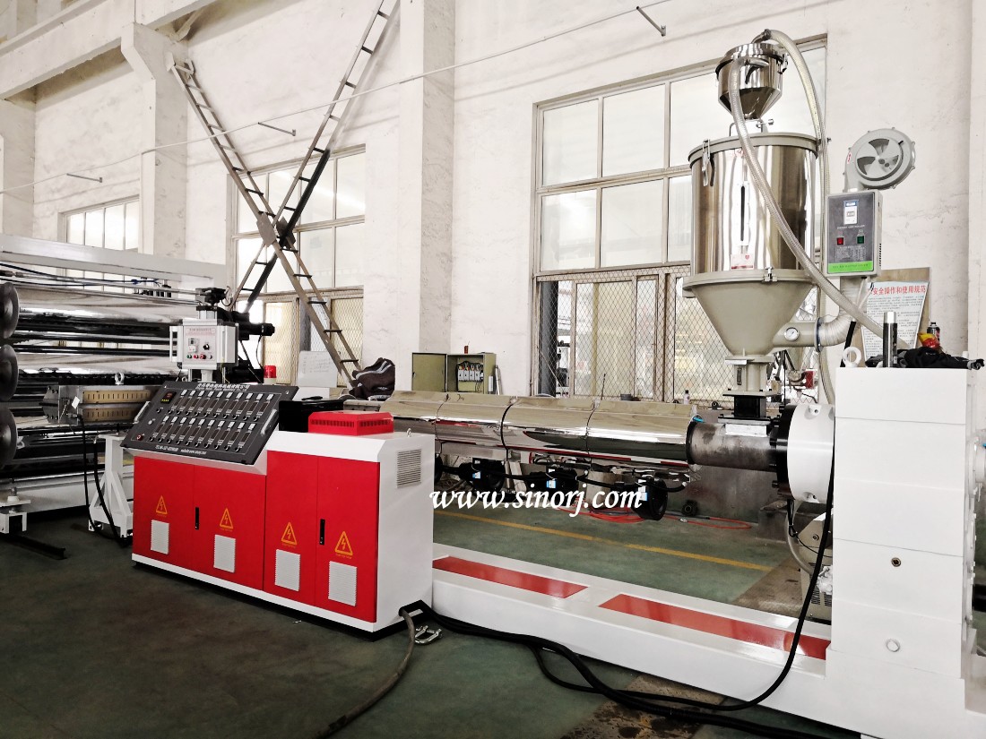 單螺桿擠出機(jī),衣架式模具,三輥壓光機(jī),冷卻托架,牽引機(jī),剪板機(jī),橫向切割機(jī),收卷機(jī)和其他輔助機(jī)械組成。